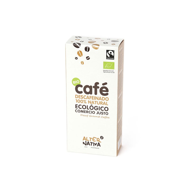 Café descafeinado molido ecológico de Comercio Justo de tueste natural.