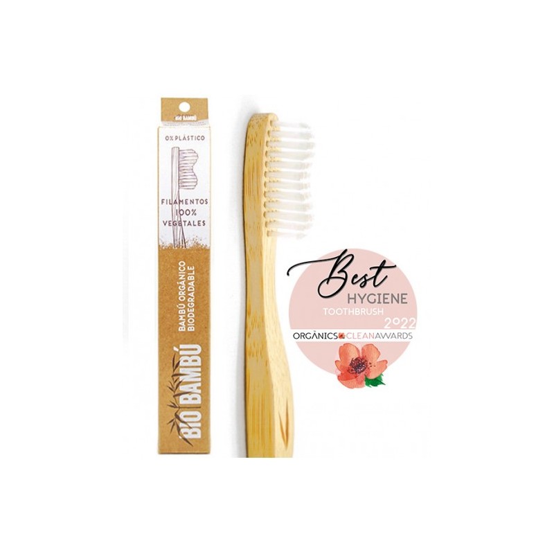 Cepillo de dientes con mango de bambú ecológico y filamentos 100% Biobasados, certificados USDA BioPreferred Program.  Dureza suave - media