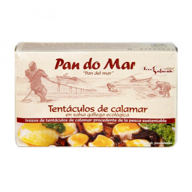 Trozos de tentáculos del calamar gigante pescado por los pescadores nativos de la costa del Pacífico peruano, cocidos al vapor y envasados en la típica salsa gallega elaborada con aceite de oliva virgen extra, pimentón y especies, procedentes de la agricultura ecológica española certificada.