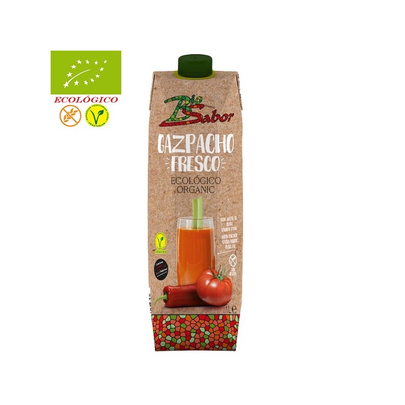 Ensalada líquida tradicional de nuestra dieta mediterránea, elaborada a base de muestras propias hortalizas ecológicas (tomate, pimiento, pepino, cebolla, ajo, vinagre, pan y aceite de oliva virgen extra ecológico).